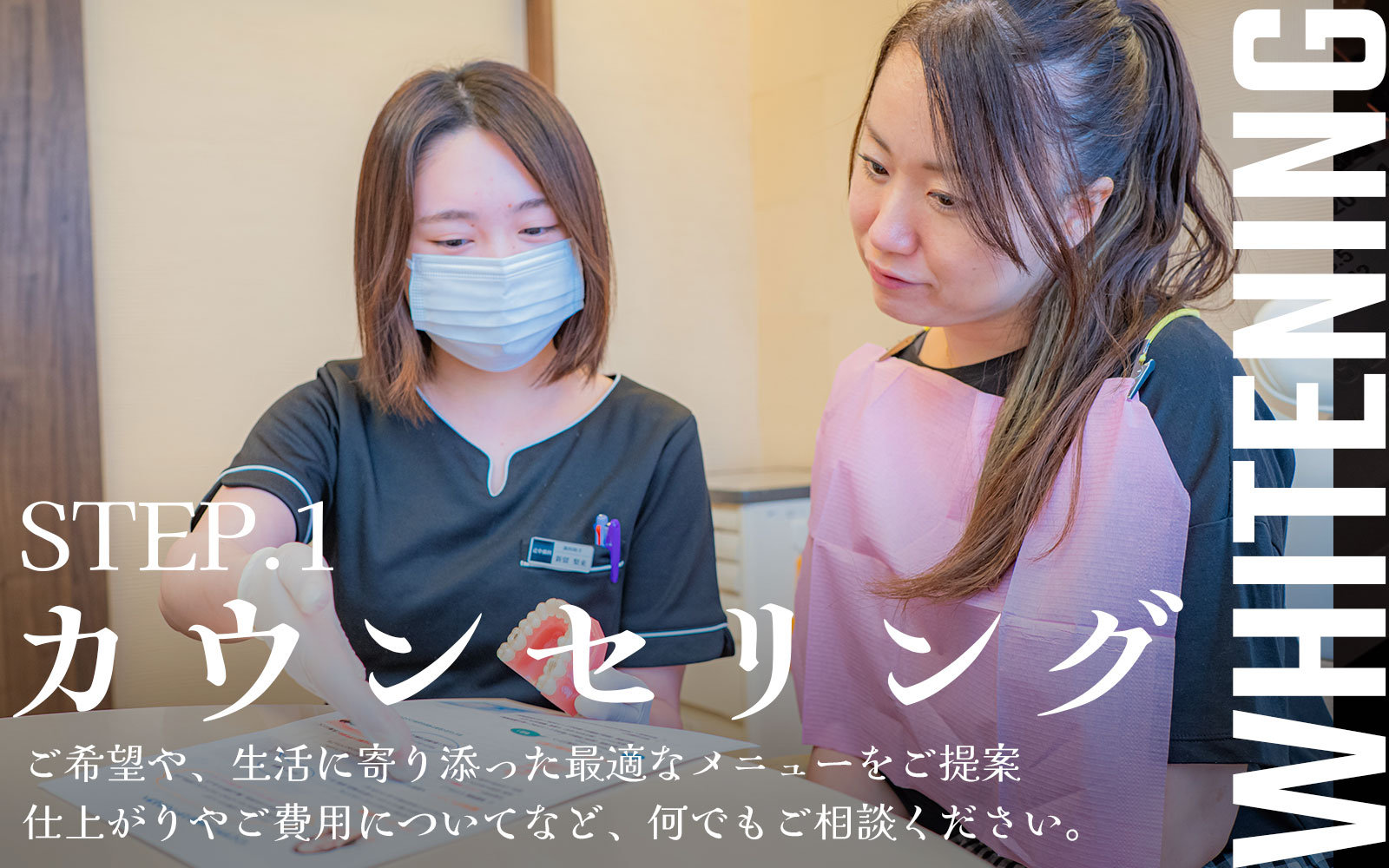 ホワイニングについてのご説明をいたします。不安な点や疑問、は何でもご相談ください。ホワイトニングを「どうしてやりたいのか?」「こんなふうになりたい」といったご希望を伝えていただくことでより、思いに寄り添ったご提案が可能です!